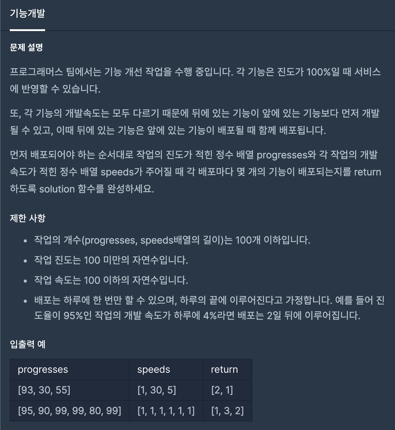 프로그래머스 팀에서는 기능 개선 작업을 수행 중입니다. 각 기능은 진도가 100%일 때 서비스에 반영할 수 있습니다. 또, 각 기능의 개발속도는 모두 다르기 때문에 뒤에 있는 기능이 앞에 있는