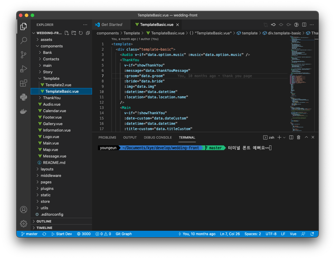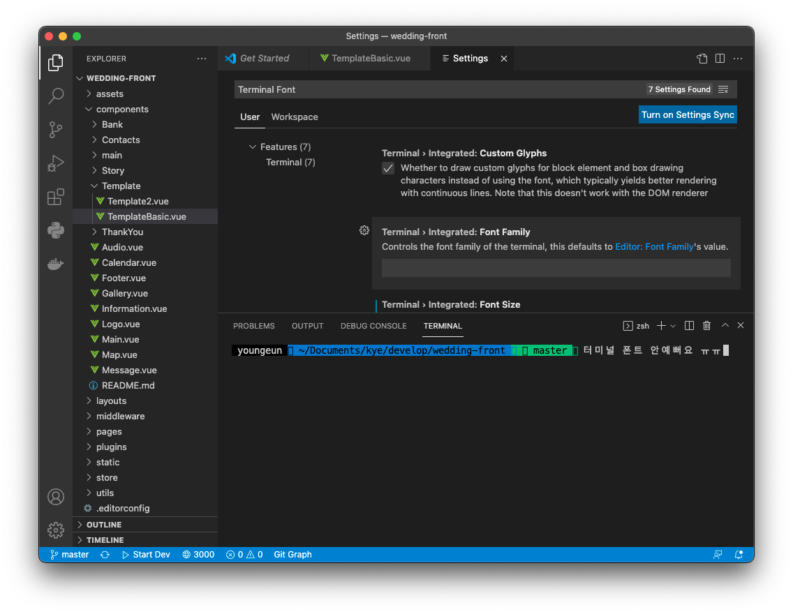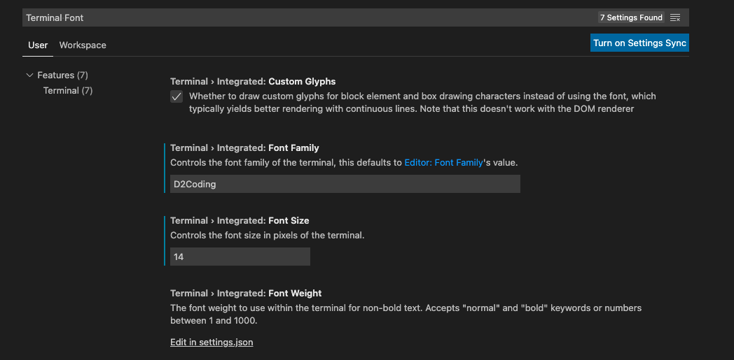 주로 한국인 개발자는 D2Coding 폰트를 사용하는데, VSCode의 터미널에서도 기호가 예쁘게 보이려면 따로 폰트를 설정해줘야한다.