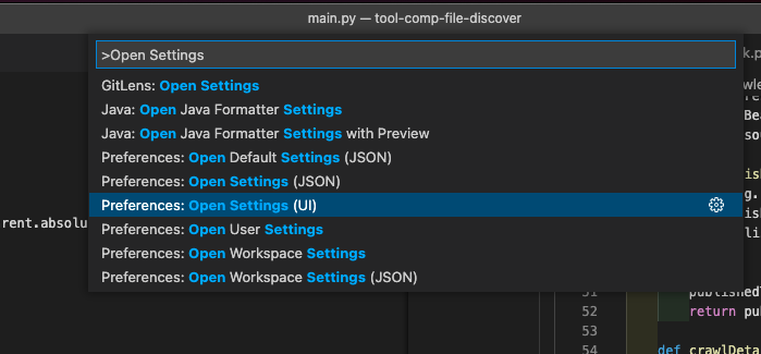 커멘드+P 누르고 ">Open Settings" 입력하고 "Preference: Open Settings"를 찾아 엔터친다.